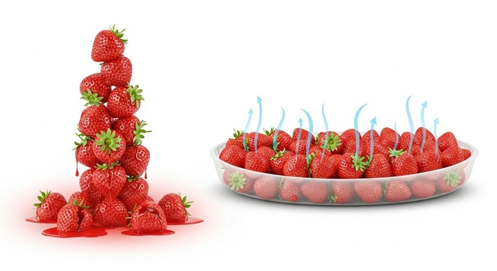 When strawberries pile up, stress builds – those near the base take the worst hit under weight and pressure. Line them horizontally instead; that cuts down harm while letting air flow easily from side to side.