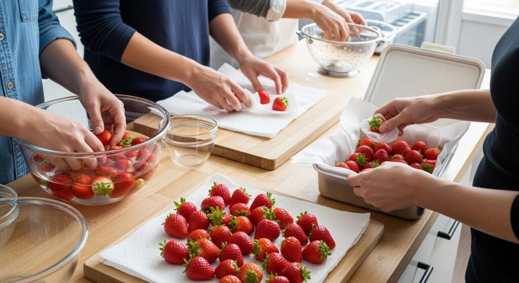 A single rotten strawberry might ruin the whole batch since mold moves fast in tight spaces. Once you arrive, separate the container carefully – toss out any fruit that leaks, looks damaged, or grows green patches.