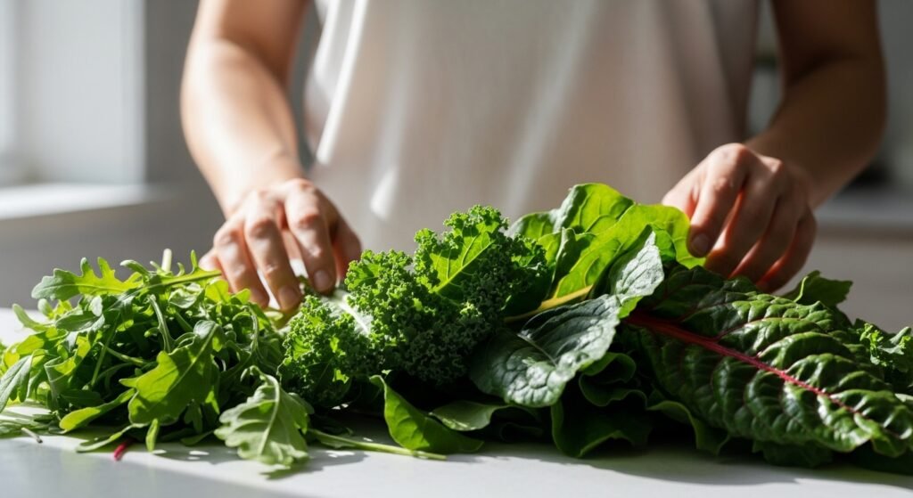 Kale, arugula and Swiss chard are leafy greens that are common ingredients in the Mediterranean cuisine. These vegetables are good sources of vitamins, minerals and fiber which aid in the digestive process in addition to adding new flavor and texture to the soups and salads as well as warm grain preparations.