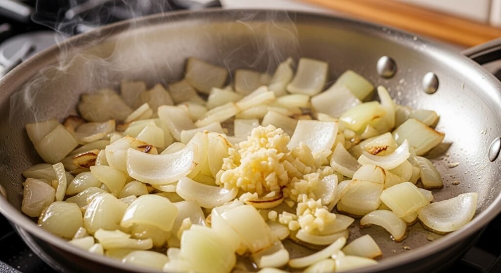 First add the chopped onion and cook it until it becomes soft and a little bit golden and then add the garlic and cook it a little bit before it smells. This action creates a tasty foundation which is carried throughout the dish.