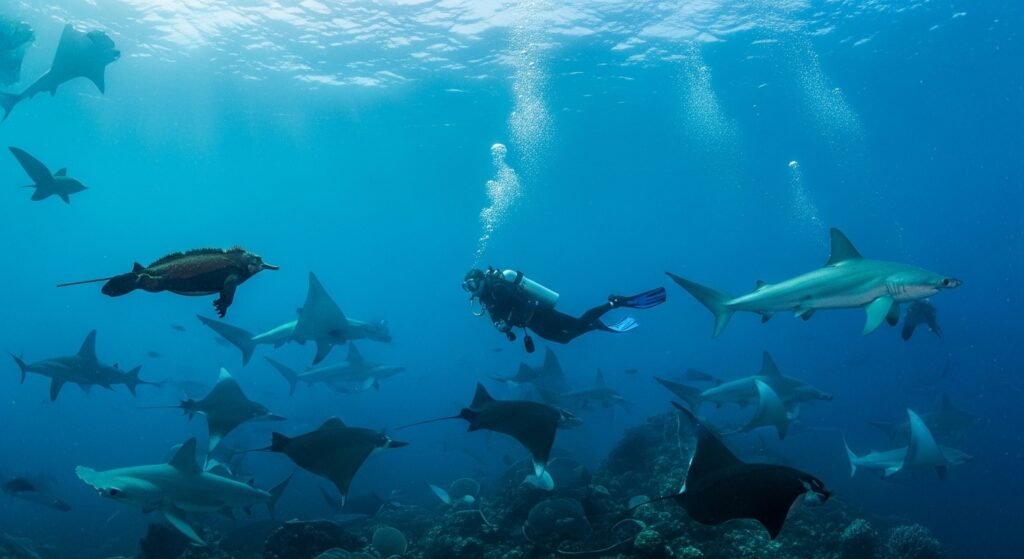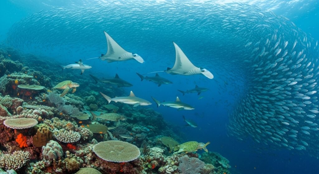 Manta shaft shafts, reef sharks, turtles, and enormous fish seminaries are drawn to the nutrient-rich waters brought by the important currents. The submarine environment of the Demesne features steep walls, coral- covered mountains, and various reefs that bag with marine life.