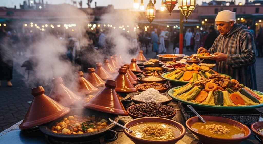 Marrakech offers a feast of spices and aromas. Tagines, couscous, and harira haze are  masses, frequently seasoned with saffron, cumin, and cinnamon. The night request at Jemaa el-Fnaa is a lively food destination where you can test everything from grilled flesh to sweet afters.