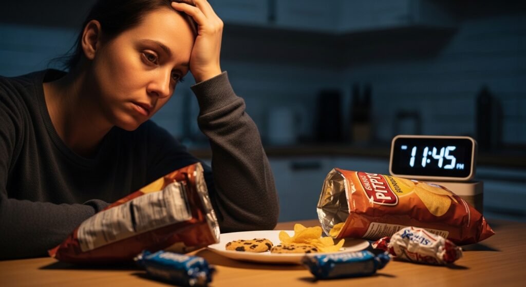 Natural rhythms of the body change at night, and the body hunger hormons, ghrelin, can increase, and the power of will can be less efficient after a hard day of decision making. Exhaustion decreases the capability to decide on food thoughtfully, hence fast convenience food gains more attractiveness than healthy eating.