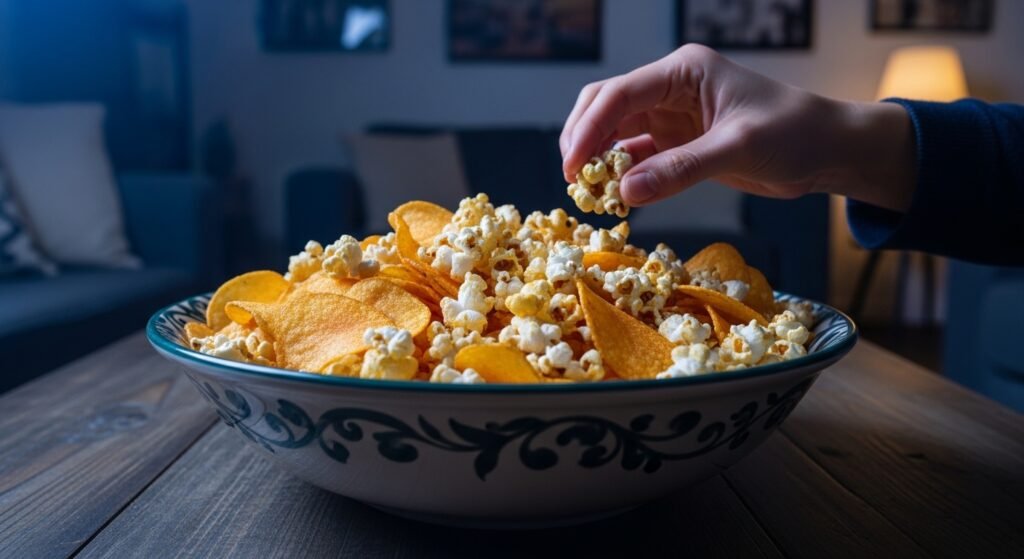 A combination of salt and crunch provided by chips, crackers, and buttery popcorn is the best way to trigger the reward system of the brain. Salt makes food taste better and invites to take another bite, and suddenly it is easy to eat big amounts of food without paying attention.