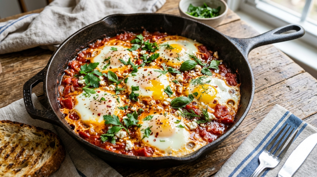 Shakshouka, a straightforward but juicy mess of eggs carpeted in a racy tomato and pepper sauce, has become a global fave for breakfast. The versatility can be served as breakfast, lunch, or dinner, and its capability to produce strong flavours with introductory constituents is what makes it so charming.