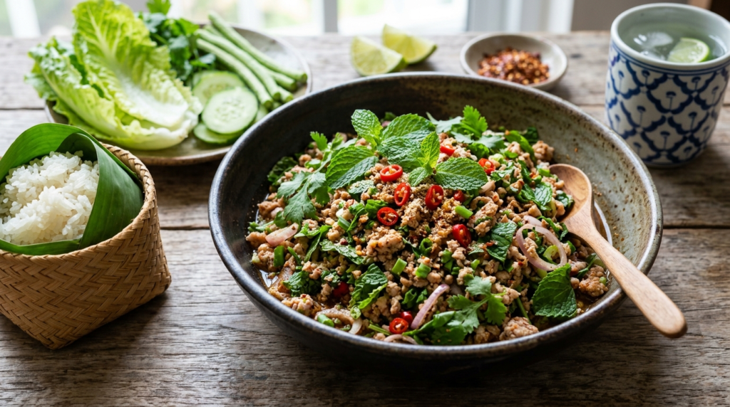 A diced meat salad seasoned with lime juice, fish sauce, and heated rice greasepaint, larb offers a unique combination of newness and umami. Its light yet scrumptious profile aligns with global shifts toward healthier, condiment- driven cookeries.