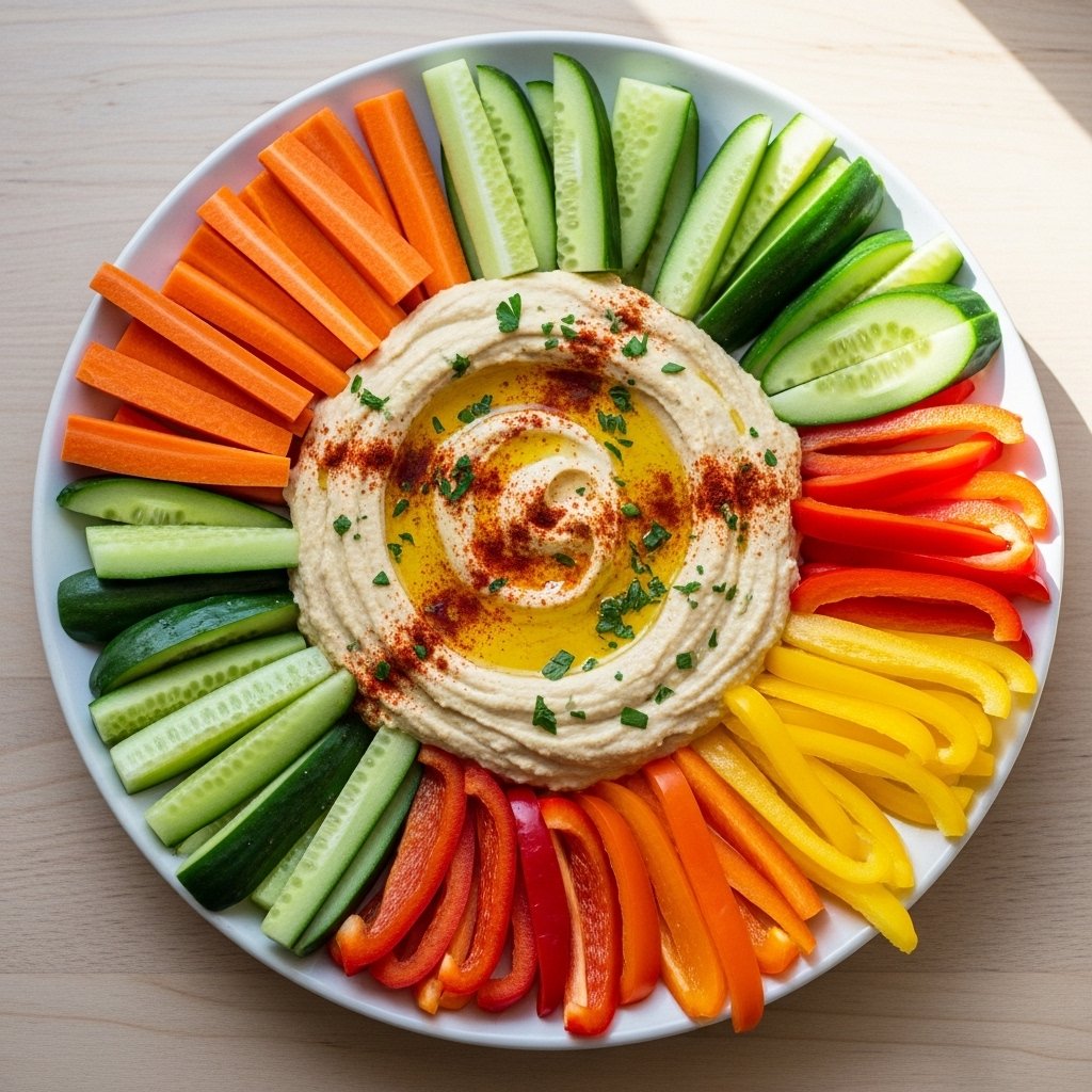 The light meal of hummus and chickpeas provides plant based protein and fiber that serve to sustain normal energy levels throughout the day. When it is eaten with raw vegetables it provides volume and crunch, making it a snack that feels generous and at the same time maintains constant fullness.