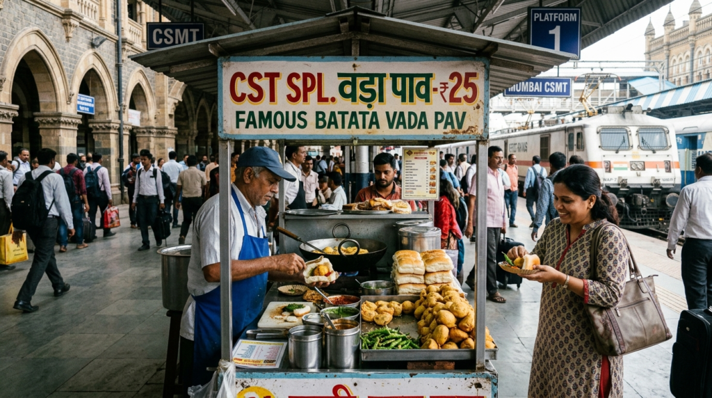 In Mumbai, the megacity’s grim pace extends into the night. Near CST station, merchandisers gossip out racy vada pav, a deep- fried potato cutlet squeezed in a bun with chutneys, simple, fiery, and deeply satisfying.