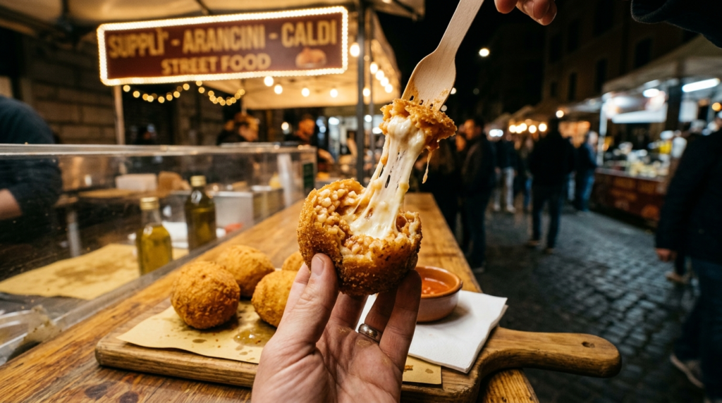 In Rome’s Trastevere neighborhood, late gloamings call for suppli, crisp rice balls filled with mozzarella. These golden bites, frequently seized on the go, capture the substance of Roman road food culture.