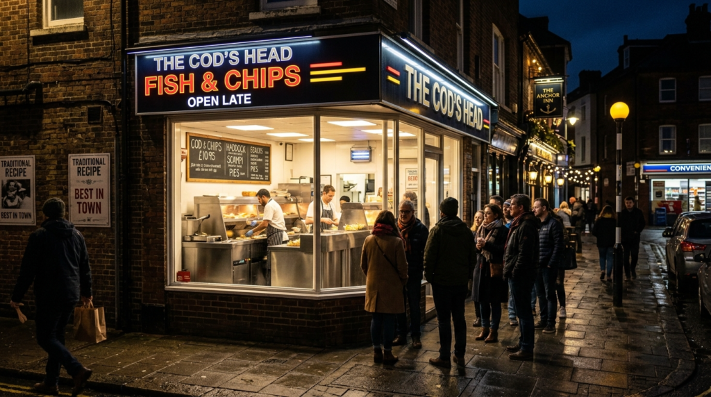 London’s late- night bakeries keep the classic fish and chips alive. Crisp battered fish paired with thick- cut feasts and ginger hits else when enjoyed after a long night.