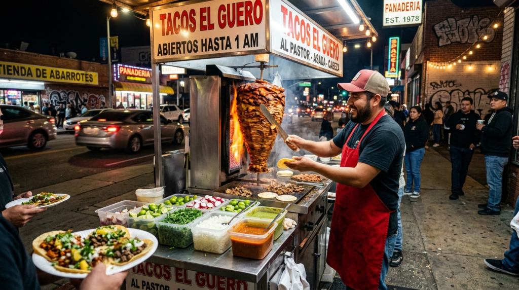 In Los Angeles, East LA’s road corners light up with taco stands after dark. Lately grilled flesh, handwrought tortillas, and vibrant salsas make these road tacos a late- night ritual for locals.