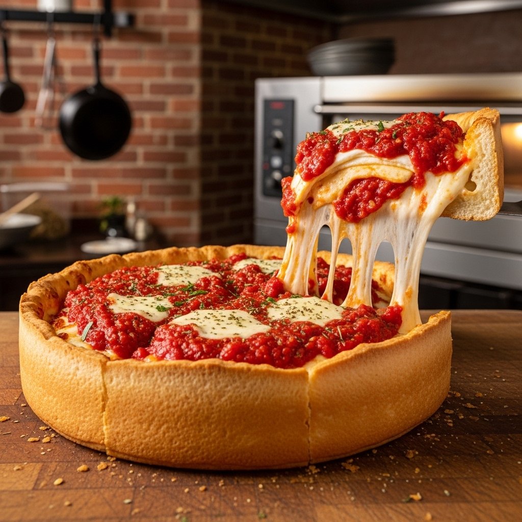 Chicago-style Deep-Dish Pizza resembles a casserole dish instead of a flatbread pizza, the dish contains layers of cheese that rest on the base, while a thick tomato sauce with chunky texture covers everything on top and this meal embodies the “bold and big” Midwest dining tradition through its hearty size.