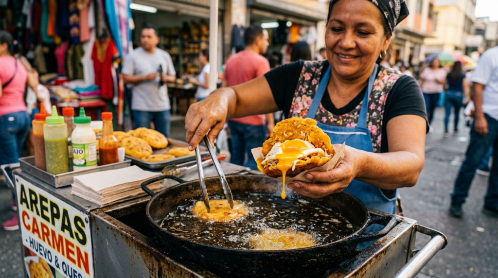 An egg and occasionally diced meat are placed into a deep- fried cornmeal patty. A favourite for breakfast, arepas de huevo can be eaten as a snack at any time. The rich yoke and crisp shell combine to produce a layered texture that’s both comforting and decadent.