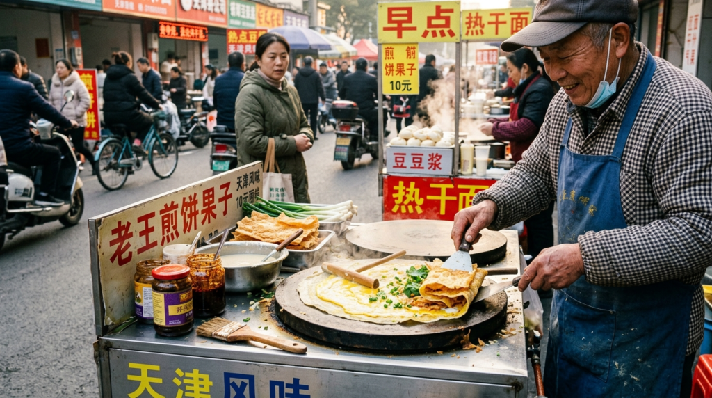 This popular Chinese breakfast road food is a savory waffle filled with egg, crisp wonton crackers, sauces, and gravies. Merchandisers prepare it fresh on hot griddles, folding it into a movable serape. The blend of textures, crisp, leathery, and soft, makes it a morning choice that many can’t go without.