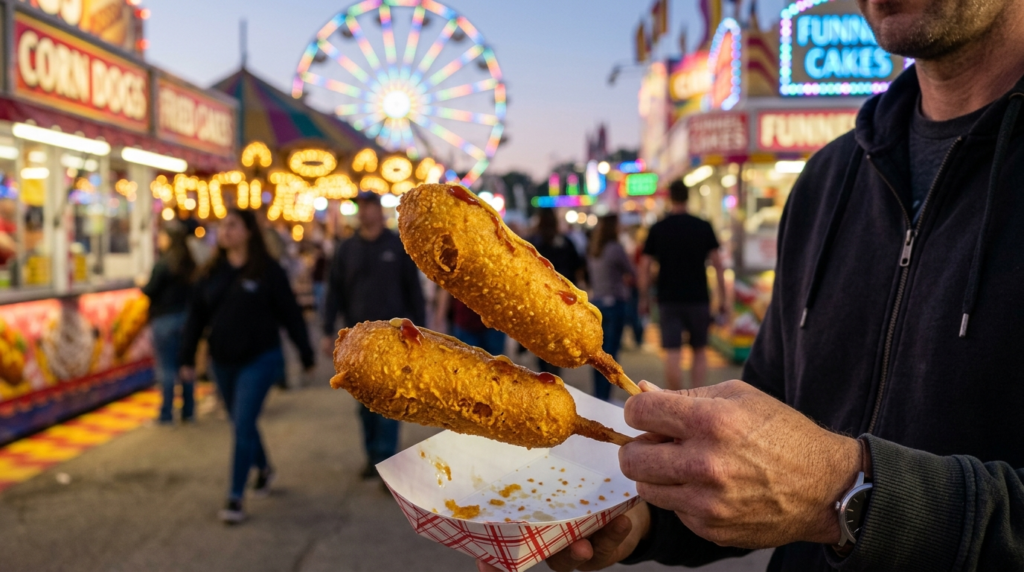 A fairground classic, corn dogs consist of hot dogs coated in a thick cornmeal batter and deep-fried until golden brown. Crisp on the outside and juicy inside, they are frequently served on a stick and paired with ketchup or mustard.