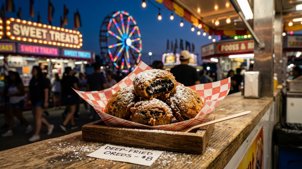 An ultramodern road food fave, fried Oreos are battered and deep- fried, creating a warm, fruity center with a crisp exterior. Frequently dusted with pulverized sugar, they are a decadent treat set up at expositions and food booths.
