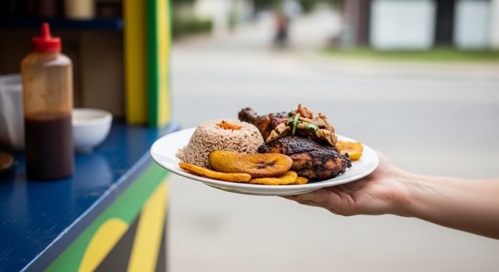 The chicken is marinated in an admixture of Scotch bonnet peppers, allspice, thyme, garlic, and other spices before being grilled sluggishly over pimento wood. The result is deeply  scrumptious meat with a charred surface and juicy innards. Street merchandisers frequently serve it with rice and peas or fried plantains.