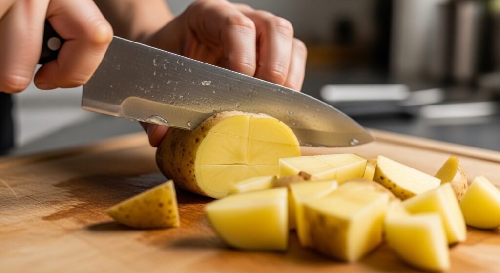 Begin with starchy potatoes like russet or Yukon gold as they will get a hard shell and remain fluffy in the inside when roasted at high temperature. Rinse and peel as needed then cut into similarly sized pieces so that they cook at the same time.