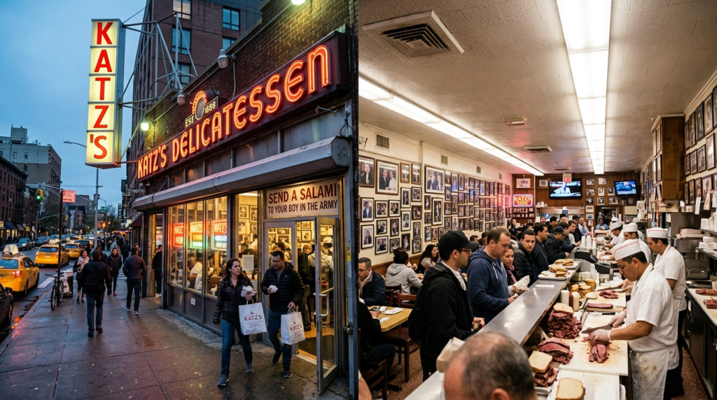 It’s well- known for its enormous, hand-carved pastrami sandwiches, which are a reflection of New York’s indigenous background. Dining there’s an authentic and nostalgic experience because of the lively environment, ticket system, and old academe charm.