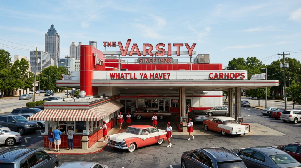 An Atlanta corner since 1928, The Varsity is notorious for its chili dogs, frosted orange drinks, and fast-paced service. It’s one of the largest drive-in cafes in the world and a nostalgic symbol of American roadside dining culture.