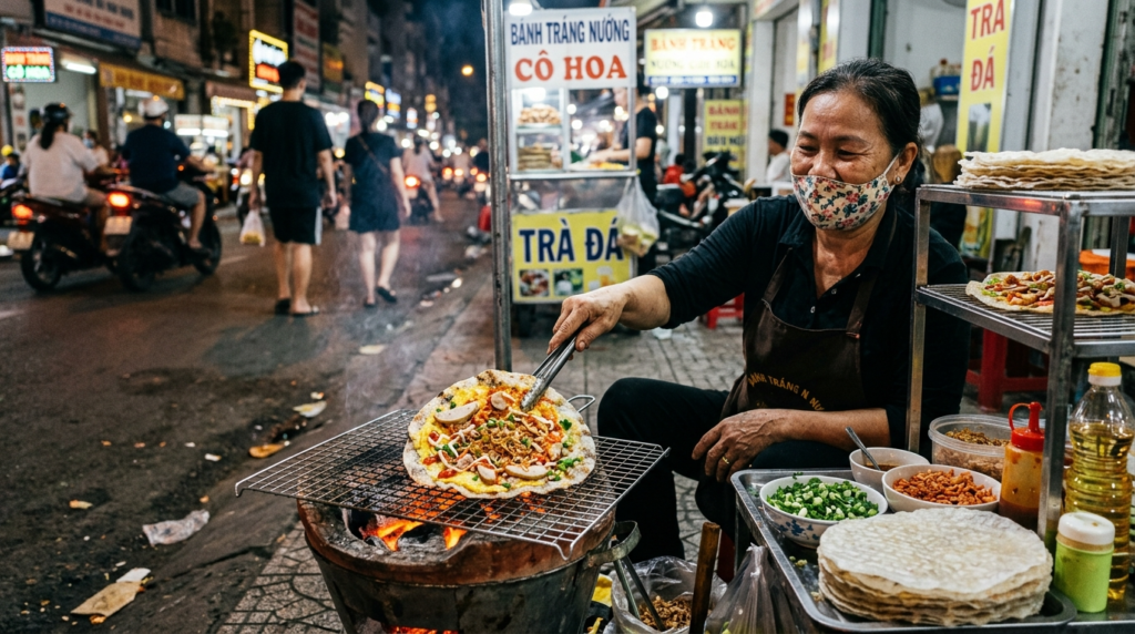 Frequently called “Vietnamese Pizza,” this road snack from Da Lat uses rice paper as a base, topped with egg, scallions, dried shrimp, and chili sauce. It is crisp, hoarse, and packed with umami.